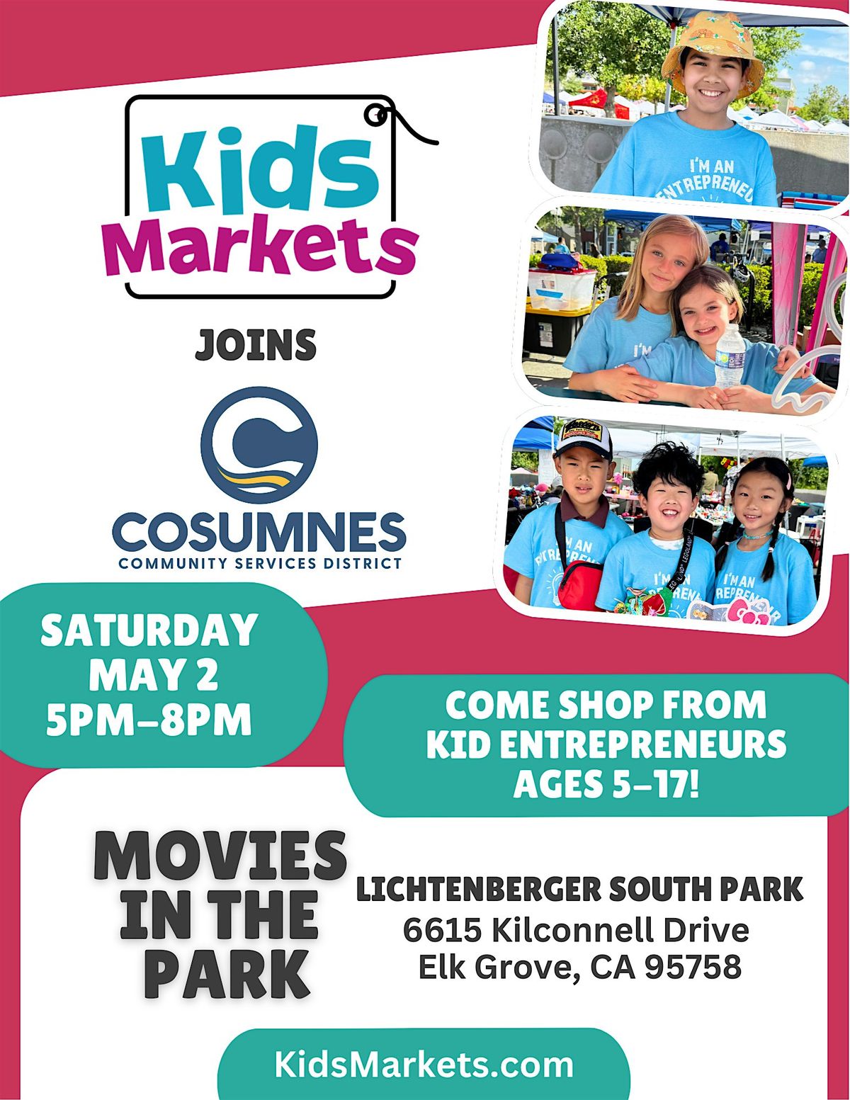 Join us for fun-filled evenings at Movies in the Park featuring Kids Markets hosted by Consumnes CSD! Enjoy a great movie under the stars while exploring cool stalls run by local kids. Perfect for families looking to chill out and support young entrepreneurs. Don’t miss out on the excitement and community vibes. Bring your friends and make it a night to remember! This event is free to attend... If you would like to register your kid or find out more - check out the webiste! https://www.kidsmarkets.com/markets/elk-grove