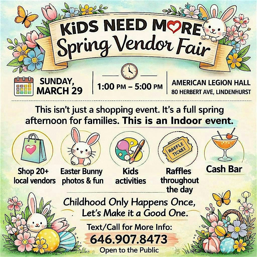 LINDENHURST, NY — Families looking for an easy and enjoyable way to spend a Sunday afternoon are invited to the KiDS NEED MoRE Spring Vendor Fair on Sunday, March 29 from 1–5 PM at the American Legion Hall in Lindenhurst.