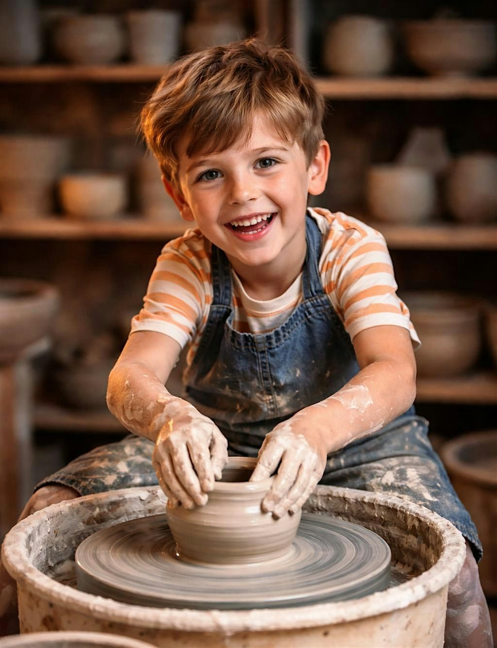Get ready for some hands-on fun at our in-person Kid's Pottery Wheel Class! Little artists will spin, shape, and create unique pottery masterpieces using the wheel. Perfect for kids who love to get creative and play with clay. Come join us for a messy, fun-filled experience where imagination runs wild and memories get made. Let's get those hands dirty and those smiles big!