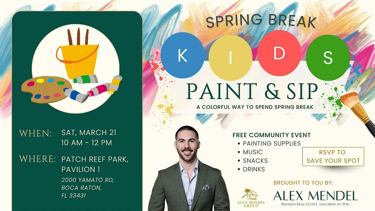 Join us for a FREE Kids Paint & Sip at Patch Reef Park on Saturday, March 21 from 10:00 AM to 12:00 PM. This family-friendly spring break event is designed for children ages 4–12 to enjoy a relaxed morning of creativity, music, snacks, and drinks in a safe outdoor setting.