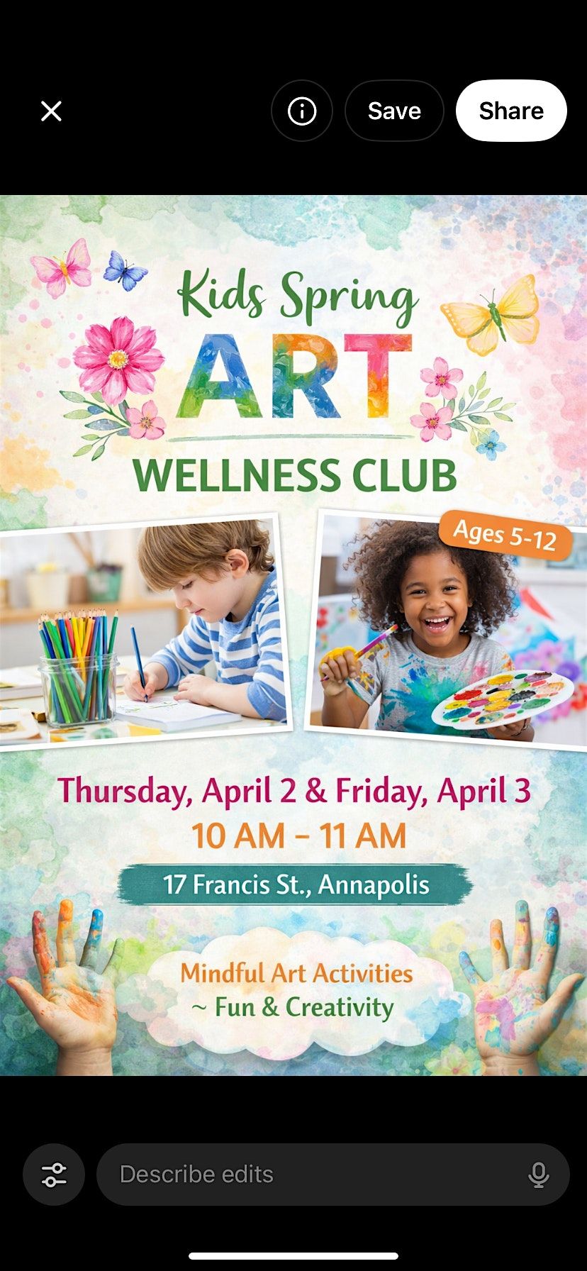 Join us for an unforgettable wellness art experience Thursday April 2 and Friday April 3.,Scholars ages 5-12 have an opportunity to create art and participate in wellness fun that will stimulate creativity and invite calm and peace.Parents are required to stay for the duration of the event.
