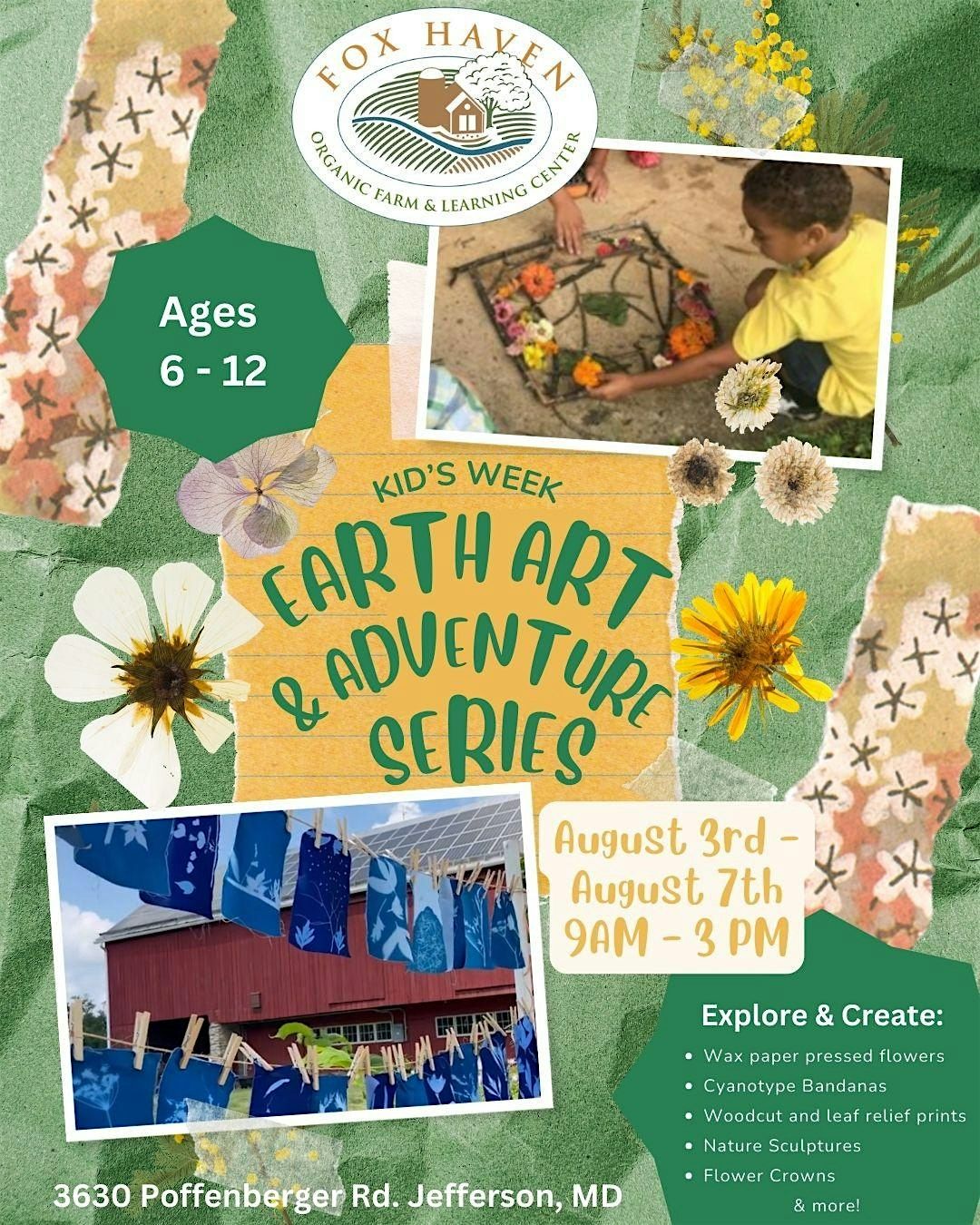 Participants will learn about ethical foraging and use herbs and flowers gathered from Fox Haven to create stunning cyanotypes. Activities include building sculptures from natural materials, painting landscapes, and sketching organic forms.