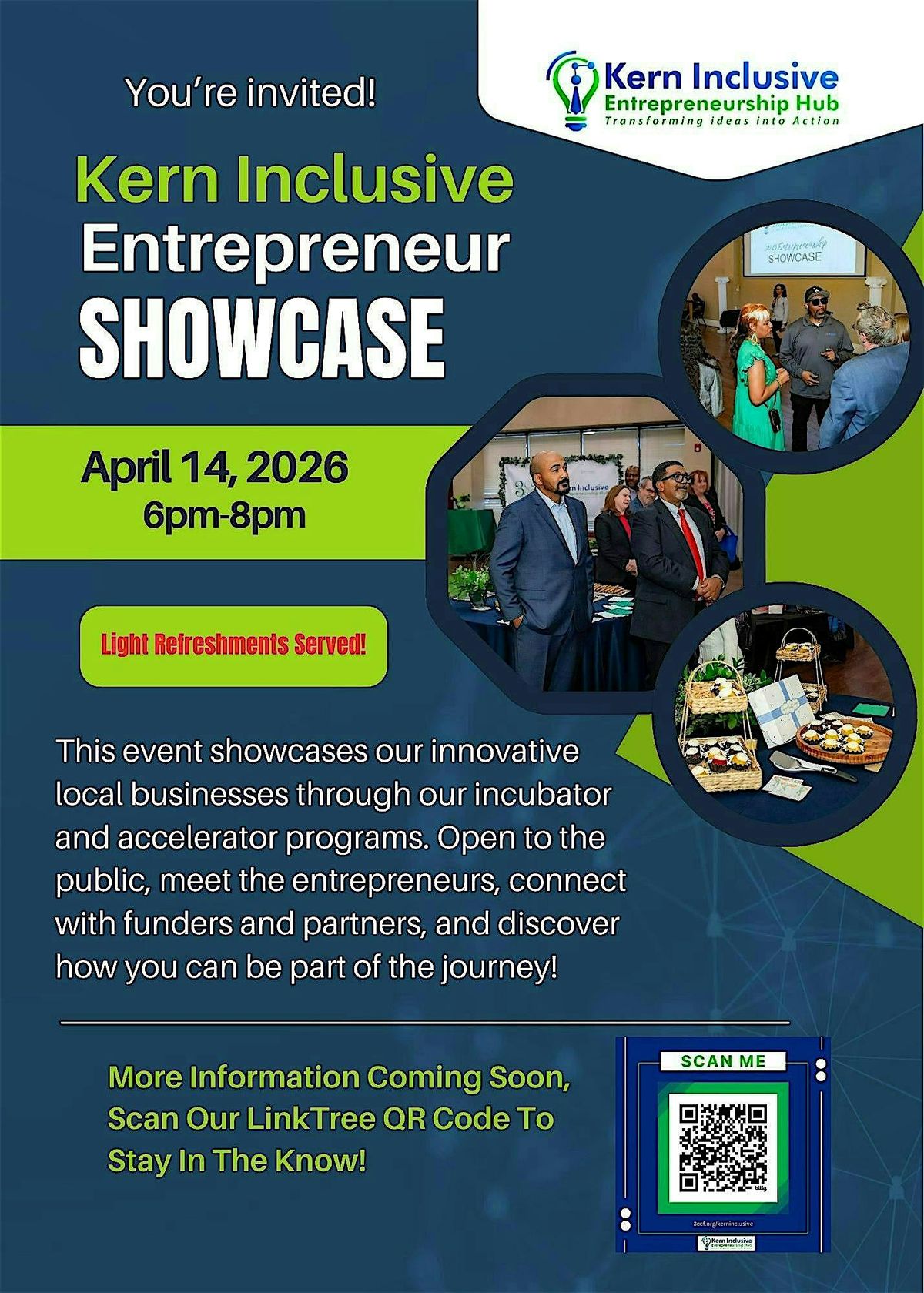 You’re invited to join our 2nd Annual Kern Inclusive Entrepreneur Showcase, an evening dedicated to highlighting the inspiring journeys of entrepreneurs who have completed our business Incubator and Accelerator programs. Connect with fellow entrepreneurs, investors, advisors... all who play a part in growing the entrepreneurial ecosystem and drive small business success. Don’t miss this opportunity to network, support local businesses, and discover new opportunities. Free and open to the public!