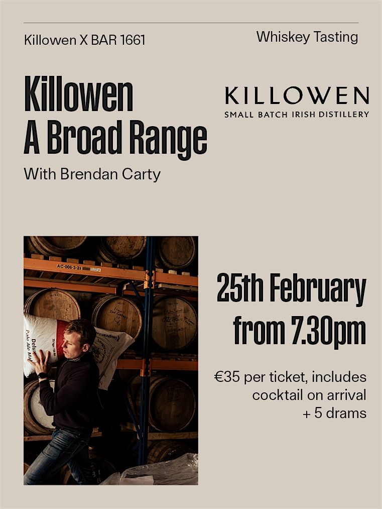 Hosted by Brendan Carty, founder and Master Distiller of Killowen Distillery, the tasting explores Killowen’s full spectrum of spirit-making. Expect their own distilled Pot Still Whiskey, alongside Rum, Column Still Whiskey, and a selection of experimental spirits that push beyond the boundaries of what can legally be called whiskey.