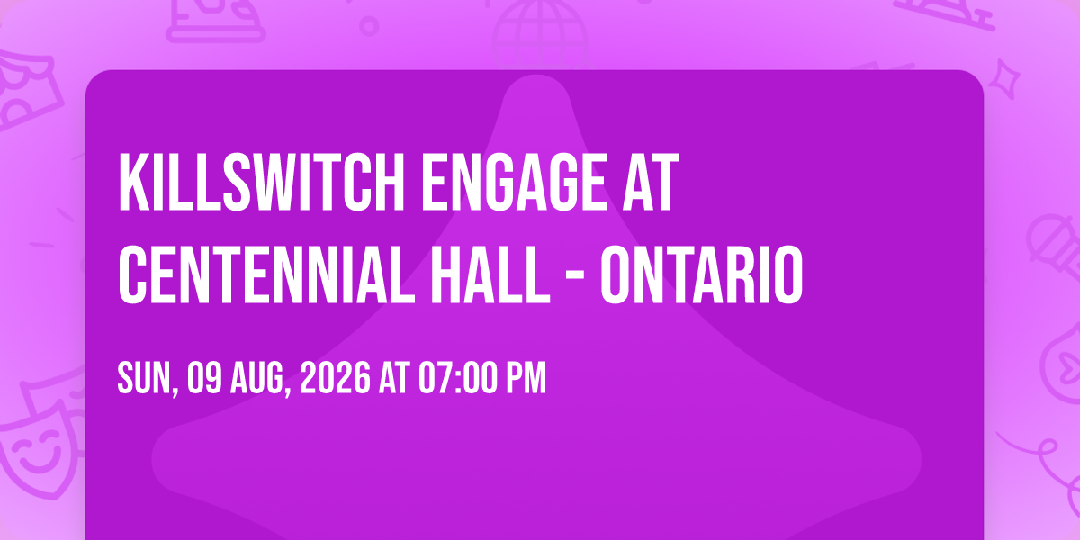 π Journey into wonder at Killswitch Engage at Centennial Hall - Ontario, where extraordinary experiences await around every corner! ποΈ Set against the backdrop of Centennial Hall - Ontario in dynamic London, ON, this event promises to exceed all expectations. π Join us on August 9th, 2026 at 07:00 PM for a celebration that combines innovation, entertainment, and community spirit in perfect harmony. β¨ There will be an atmosphere where memories are made and stories come alive, ensuring every guest experiences something truly remarkable. π This is more than just an event; it's a journey into the extraordinary!