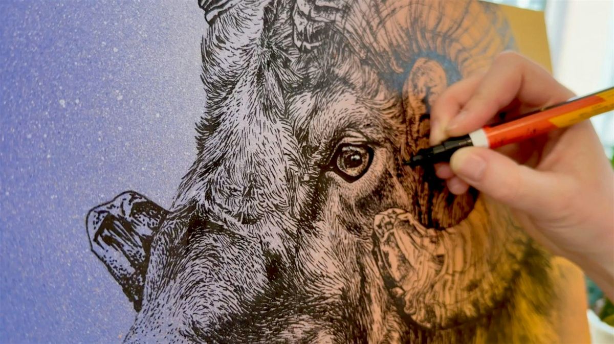 Emily Beaudoin's new body of work is a return to where she started. Her roots as an artist are wildlife, painted in black and white, long before mountains and watercolour became her language. This collection picks that thread back up and pushes it somewhere new: wildlife rendered in black acrylic paint pen on birch panel, set against colourful, impressionistic interpretations of each animal's habitat, built with spray paint.