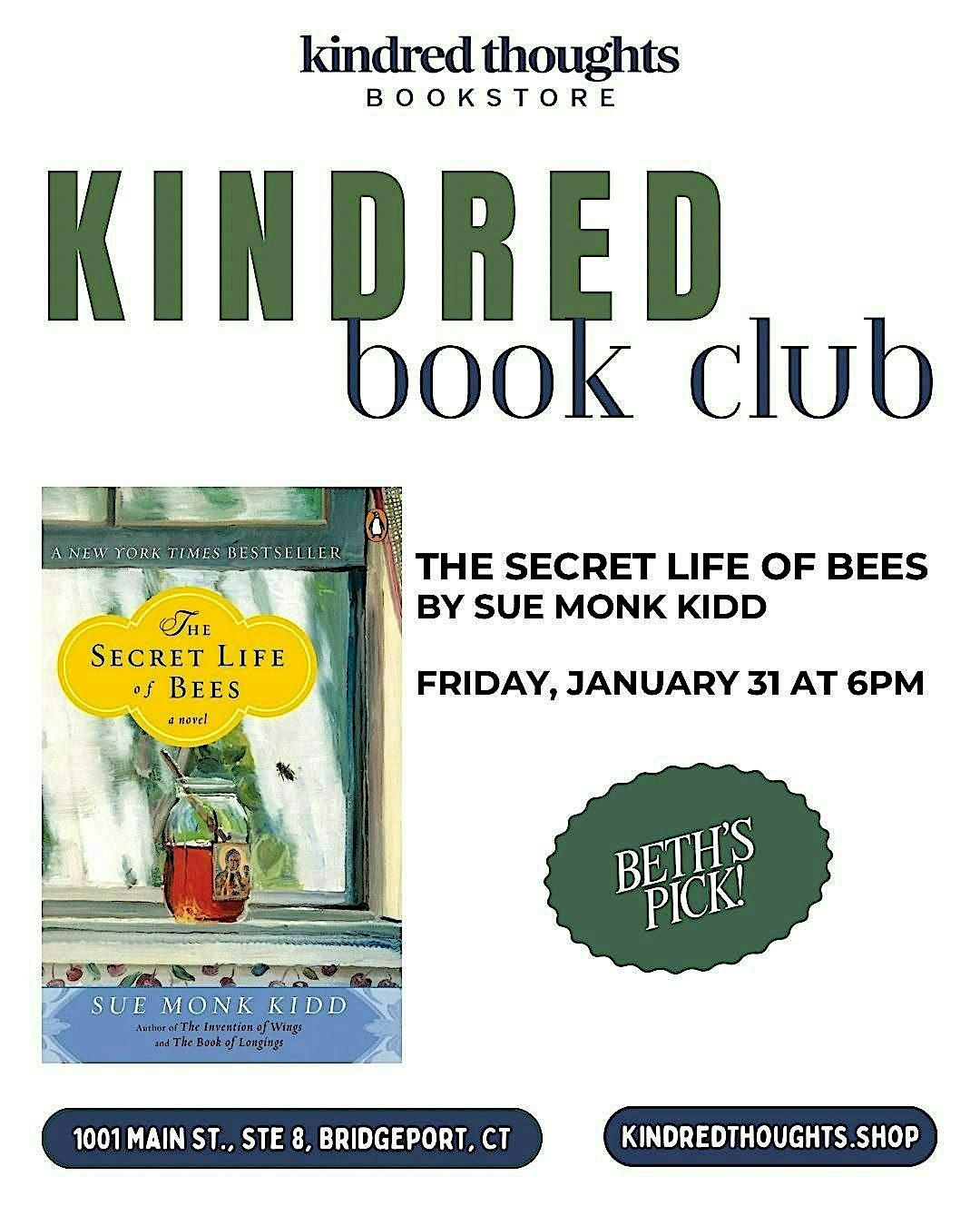 Join the members of the Kindred Book Club on Saturday, January 31st at 5pm as we delve into 'The Secret Life of Bees' by Sue Monk Kidd!