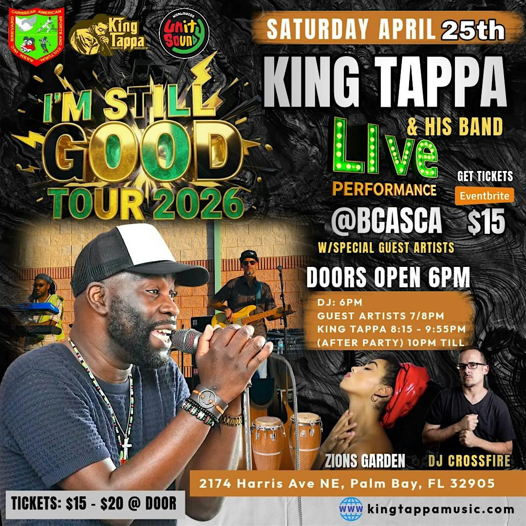 Come out for a live reggae concert and a good time in Palm Bay as King Tappa brings the “I’m Still Good” Tour to the stage with his band. Enjoy authentic reggae music, uplifting vibes, and a night built around live performance and community.