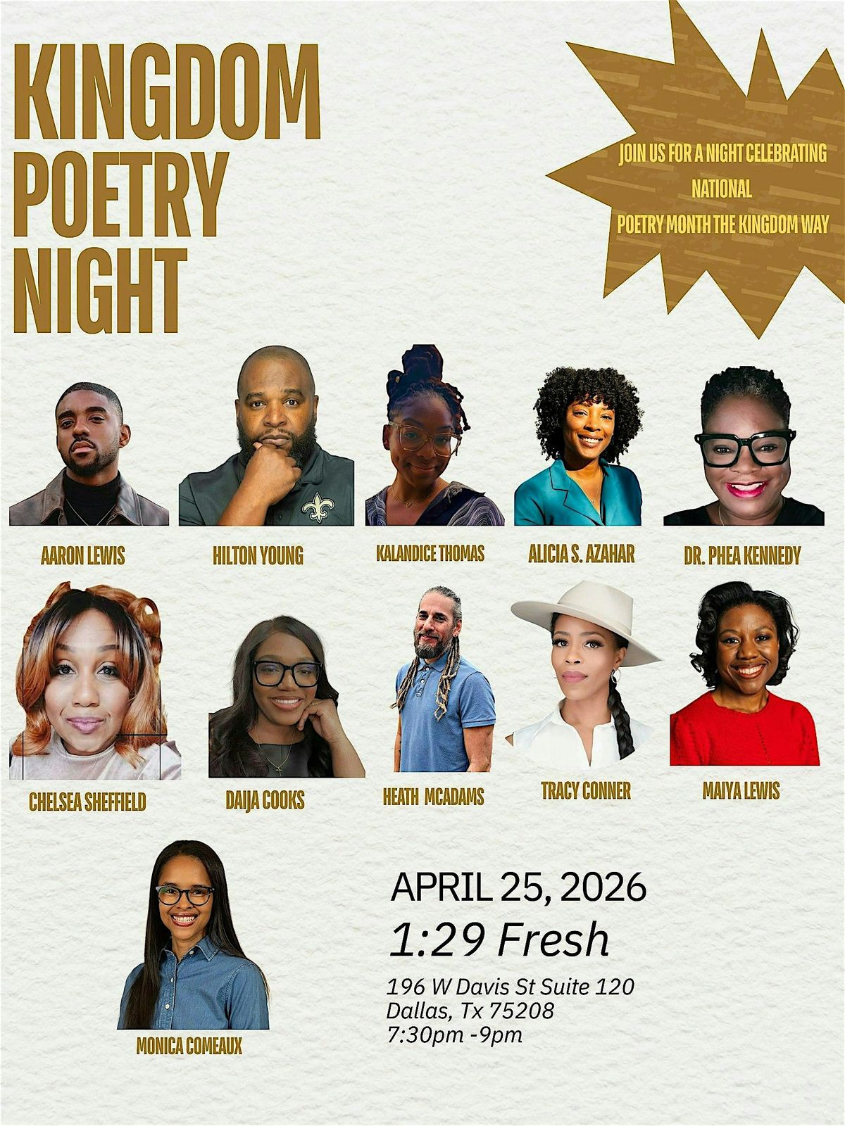 Come celebrate National Poetry Month with a powerful lineup of Kingdom-minded poets. This is an experience you don't want to miss!About this Event
