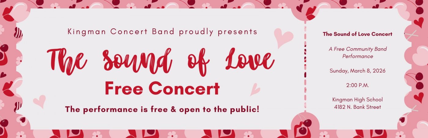 The Kingman Concert Band will proudly present "The Sound of Love" Concert on Sunday, March 8, 2026 2:00 P.M. in the auditorium of Kingman High School (4182 N. Bank Street); doors open at 1:40 P.M.