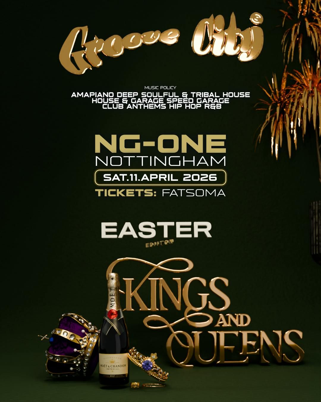 Kings & Queens – Easter Edition‘Crowns on, Groove City – Kings & Queens. If you were there last time, you already know the vibe… if you missed it, this is your sign not to slip again. We’ve levelled up with a brand-new venue, 4 royal-themed areas with 3 rooms of Underground Sounds. Come join us in our early reception lounge which opens at 9pm with free drinks, secure your tables and booths, and for true royalty, experience the VVIP lounge with its own private bar and bottle service. This is your invite – don’t just hear about it, be part of it’.