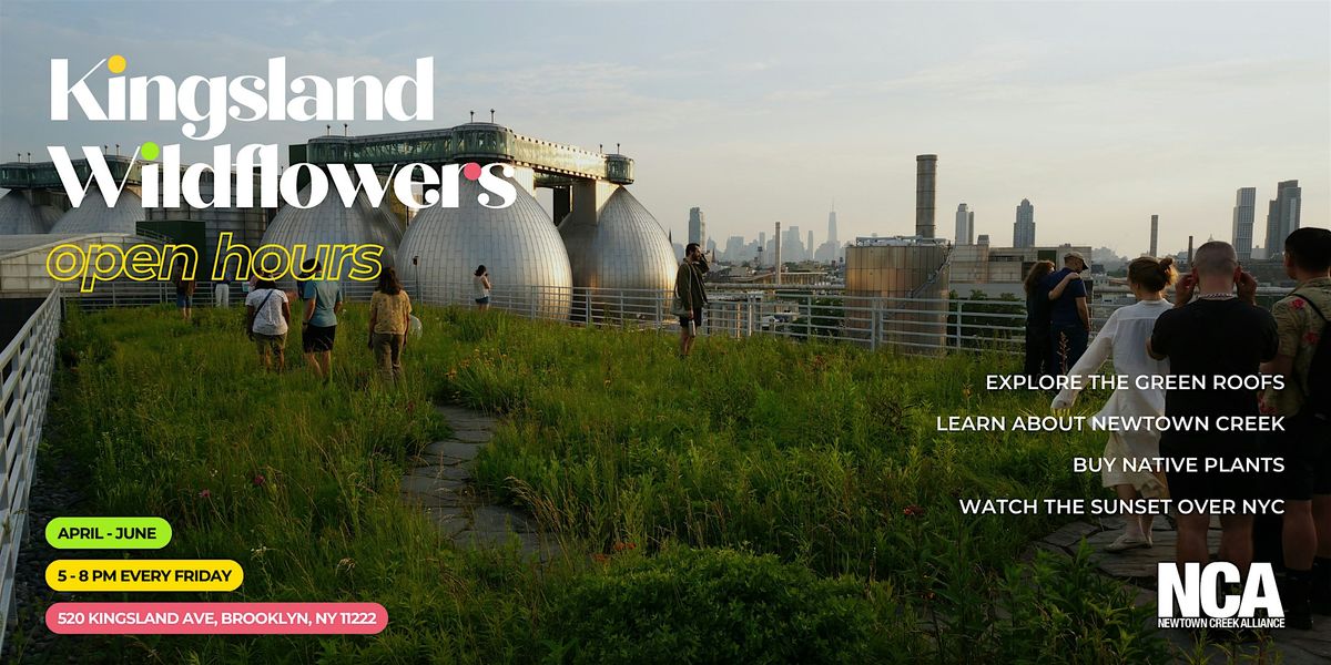 Open Hours at Kingsland Wildflowers — an opportunity for the public to learn about the green roofs, the native plants present, and the Newtown Creek while enjoying the golden hour from our scenic wildflower meadows. Open hours are free and open to the public and will take place every Friday from April 24 to June 26, 2026, weather-permitting.