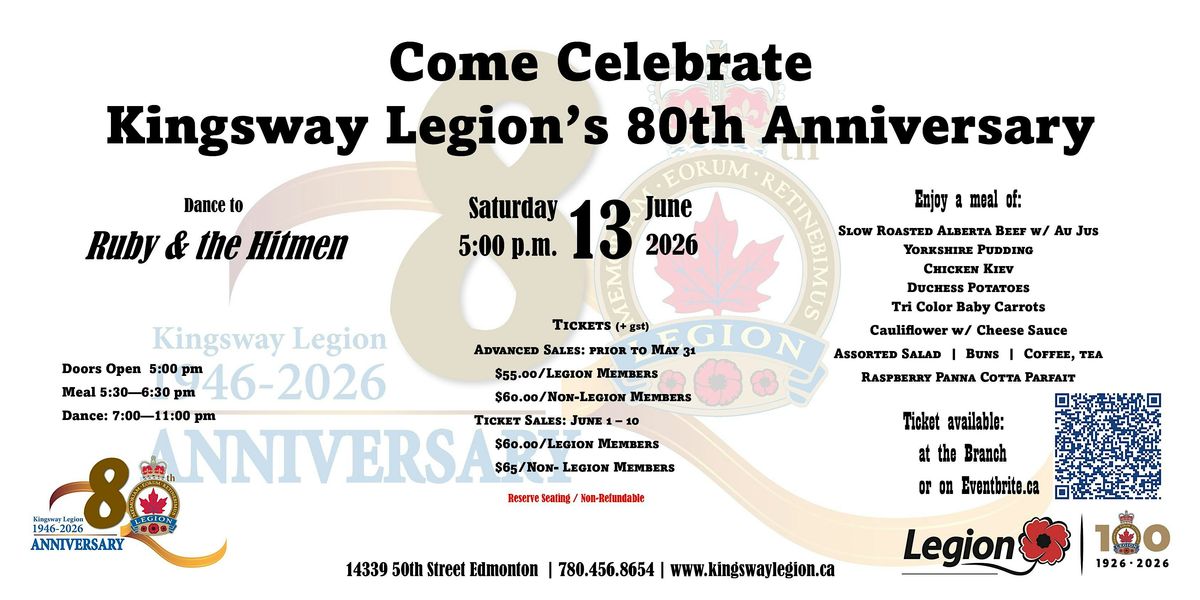 This year the Royal Canadian Legion is Celebrating 100 years. Join Kingsway Legion as we celebrate our 80th birthday.