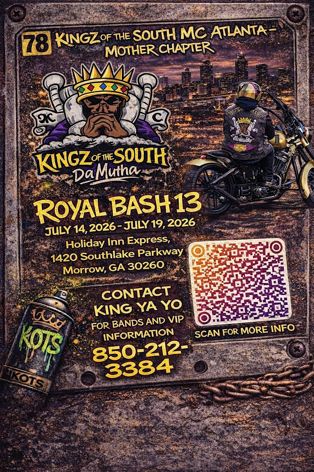 Join us for a week, in person for the ultimate celebration with the Kingz Of The South MC. It's gonna be a week full of vibes, good times, and unforgettable memories. Don't miss out on the Royal Bash 13—where the crew rolls deep and the energy stays high. For information on vip tables, tickets, please reach out to King Yayo. TEXT ONLY