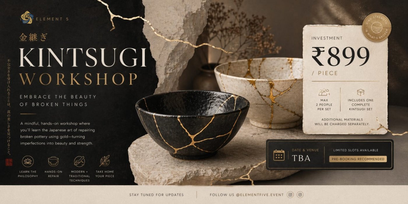 Discover the ancient Japanese art of Kintsugi — where broken pottery is repaired with gold, transforming imperfections into breathtaking beauty. This hands-on workshop by Element 5 is a mindful, meditative experience that goes far beyond crafting. You'll learn the philosophy behind Kintsugi, practice modern and traditional repair techniques, and take home a one-of-a-kind piece that you've restored yourself.
