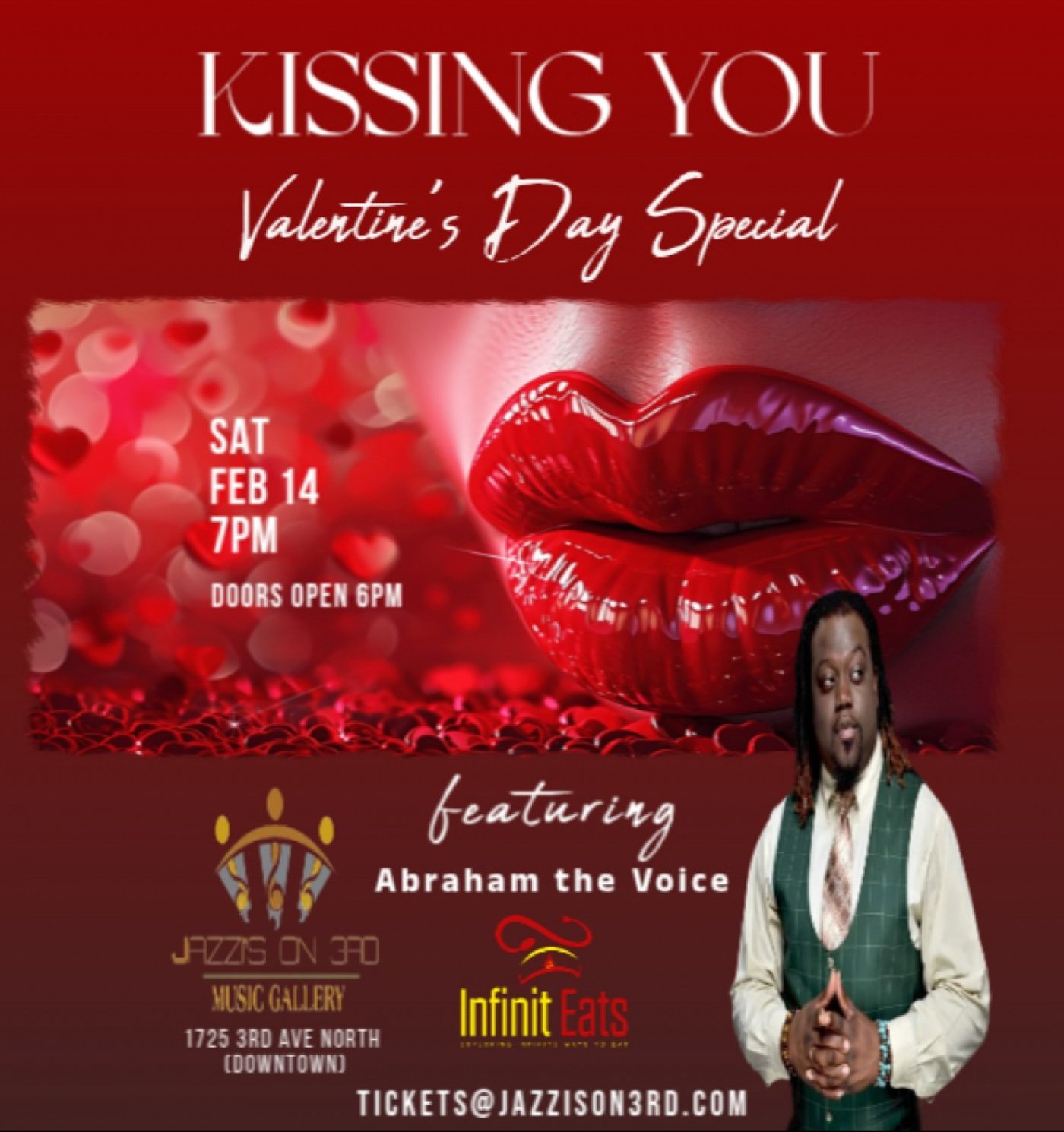 Get ready for a romantic evening at Jazzi's On 3rd Music Gallery on February 14, 2026 at 7:00 PM. Join us for an unforgettable experience filled with love and music. This special evening will feature the sultry sounds of the incomparable Abraham the Voice as he transports the audience into a romantic bliss. The night will be filled with incredible music and perfectly paired with the exquisite cuisine of the highly sought after Chef Kristopher Hicks of Infinit Eats. Don't miss out on this special night of love giving you and your special someone an experience that will surely kiss your heart. See you there!