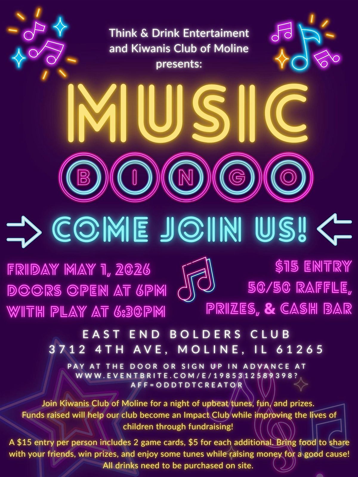Get ready for a fun evening at the Kiwanis Club of Moline's Music Bingo Night! Join us in person for a night full of great tunes, laughs, and friendly competition. It’s the perfect chance to hang out, enjoy some awesome music, and maybe even shout “Bingo!” at just the right moment. Don’t miss out on this exciting event—grab your friends and come on down!