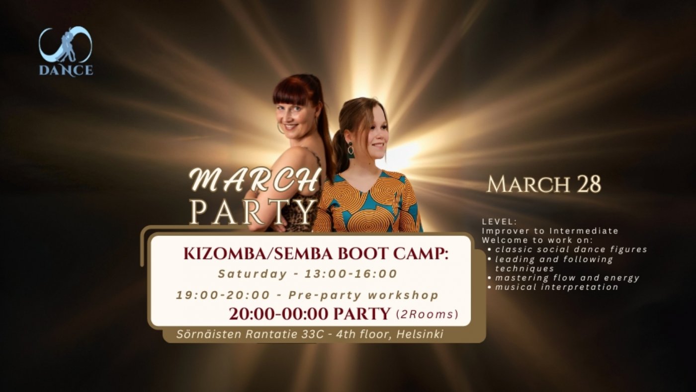 This 3hours Bootcamp is recommended for dancers who already know the basics, understand principles of Kizomba and are comfortable in main figures like Saidas and Retrocesso on the social dance floor.