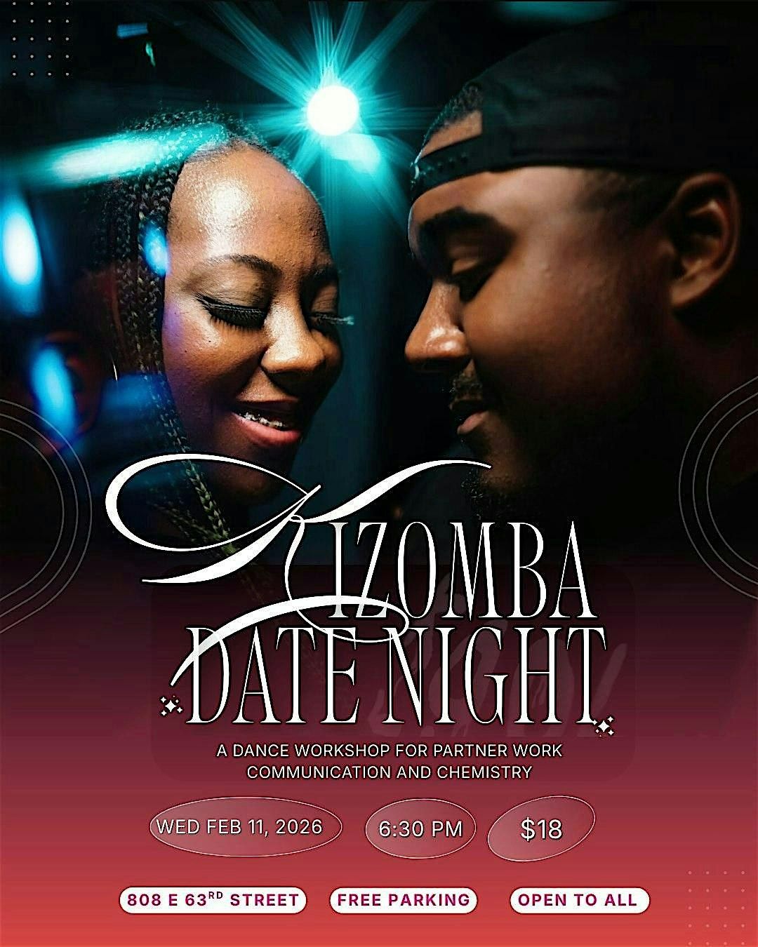 This workshop invites couples to deepen communication and chemistry through the grounded movement of Kizomba -- a partner dance rooted in Angolan Semba and Caribbean Zouk. Through the musicality of subtle yet clear cues, partners explore how to listen and respond with the whole body. Strengthen your attunement with guided exercises that emphasize intentional connection, shared presence, and playful experimentation. Come with a date, a longtime partner, or someone you simply want to connect with more deeply. No dance experience required.