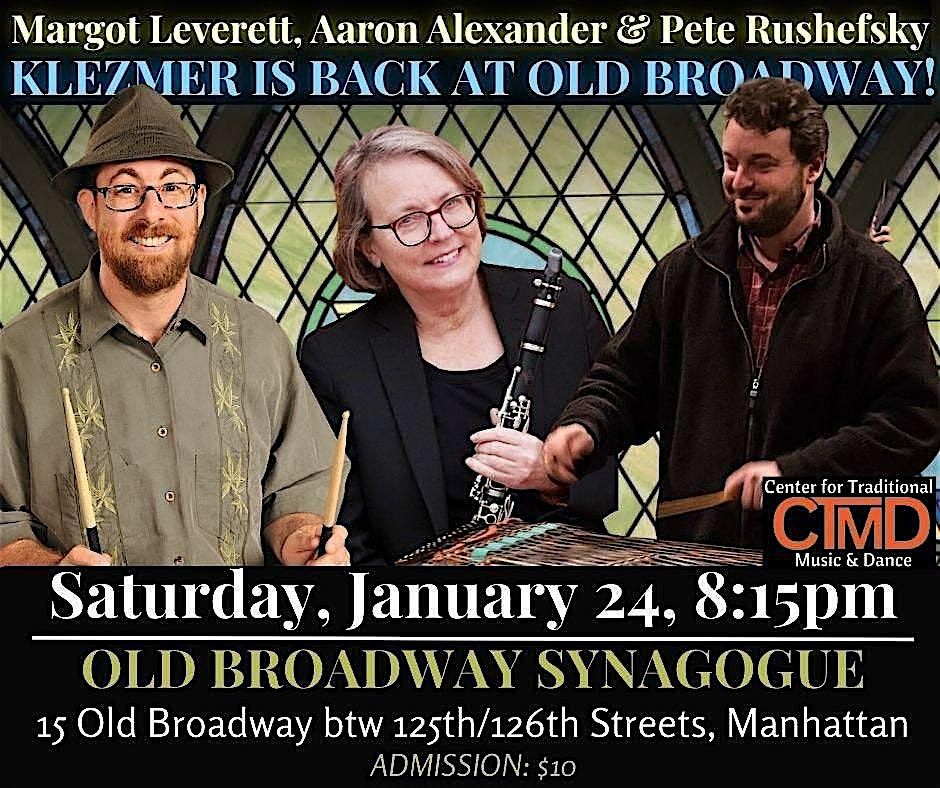 A concert featuring three of the contemporary Yiddish music scene's leading performers - featuring the return to the Old Broadway Synagogue of acclaimed klezmer clarinetist Margot Leverett, percussionist Aaron Alexander and tsimbl (cimbalom/hammered dulcimer) player Pete Rushefsky. This program is presented by the Old Broadway Synagogue in partnership with the Center for Traditional Music and Dance, Yiddish New York and the Sholem Aleichem Cultural Center.