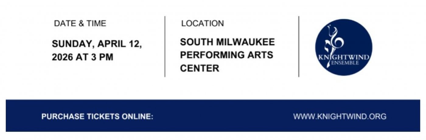 The Knightwind Ensemble, Milwaukee’s premier wind ensemble, presents their Spring Concert, under the direction of Dr. Erik N. Janners. This concert is based on Dr. Janners’ favorite works from past performances, including “To Walk With Wings” (Giroux), a musical journey of man’s quest for flight, and “Terpsichore” (Margolis) based on dances from the Court of Henry IV of France. The ending piece, “Aspen Jubilee” (Nelson), is a fast paced adventure through the Rockies with snow covered peaks and a frontier spirit. Check out our website for more information and to purchase tickets online at knightwind.org.