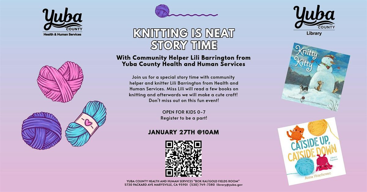 It's knot your average story time as we will be joined by community helper and knitter, Lili Barrington, from Yuba County Health and Human Services. Enjoy a good yarn or two as Miss Lili reads some knitting themed books, followed by a fun craft. Afterwards families can ask Miss Lili about knitting or her role in helping the community. The event is free and open to children ages 0-7. Please register to be a part so we can have enough crafts prepared!