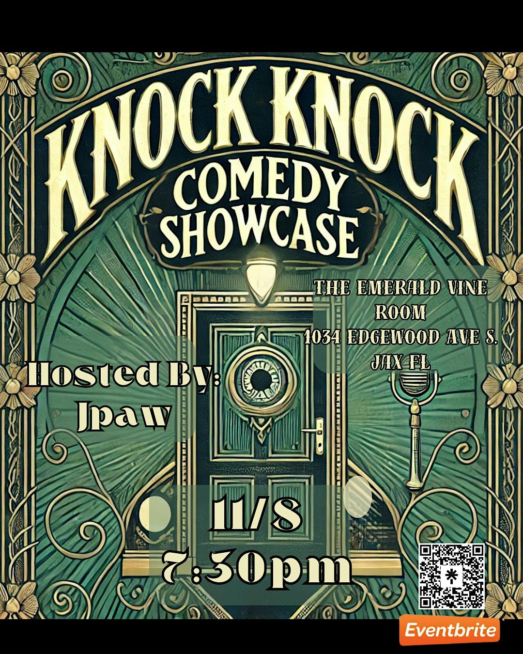 Welcome to the Knock Knock Comedy Showcase! Get ready for a night filled with laughter and good vibes at The Emerald Vine Room.