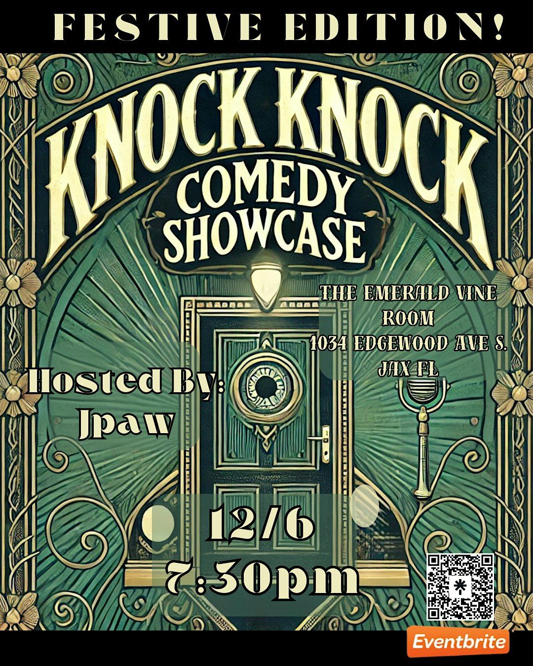 Welcome to the Knock Knock Comedy Showcase- Festive Edition! Get ready for a night filled with laughter and good vibes at The Emerald Vine Room.