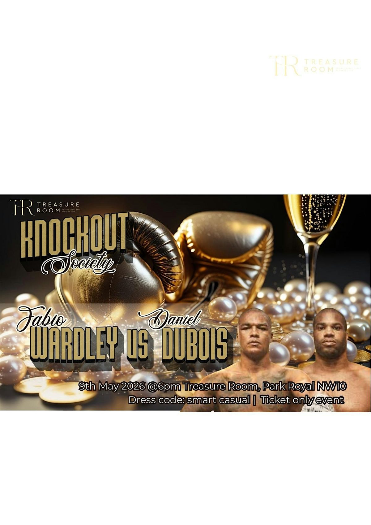 Get ready for an epic night with the Knockout Society! Join us at TReasure Room NW10 6EU on Saturday May 9, 2026 at 6:00 PM (BST) to view the highly anticipated clash between Daniel Dubois & Fabio Wardley.
