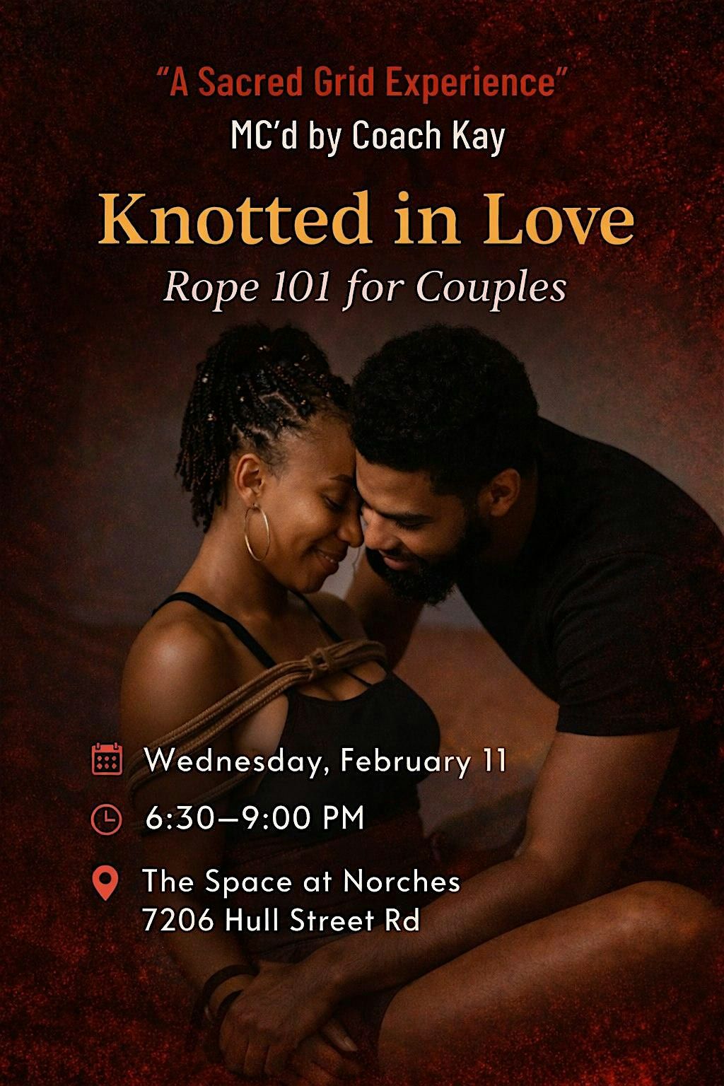Knotted in Love is a guided, beginner-friendly rope experience for couples curious about deepening connection through intentional touch, clear communication, and embodied presence.