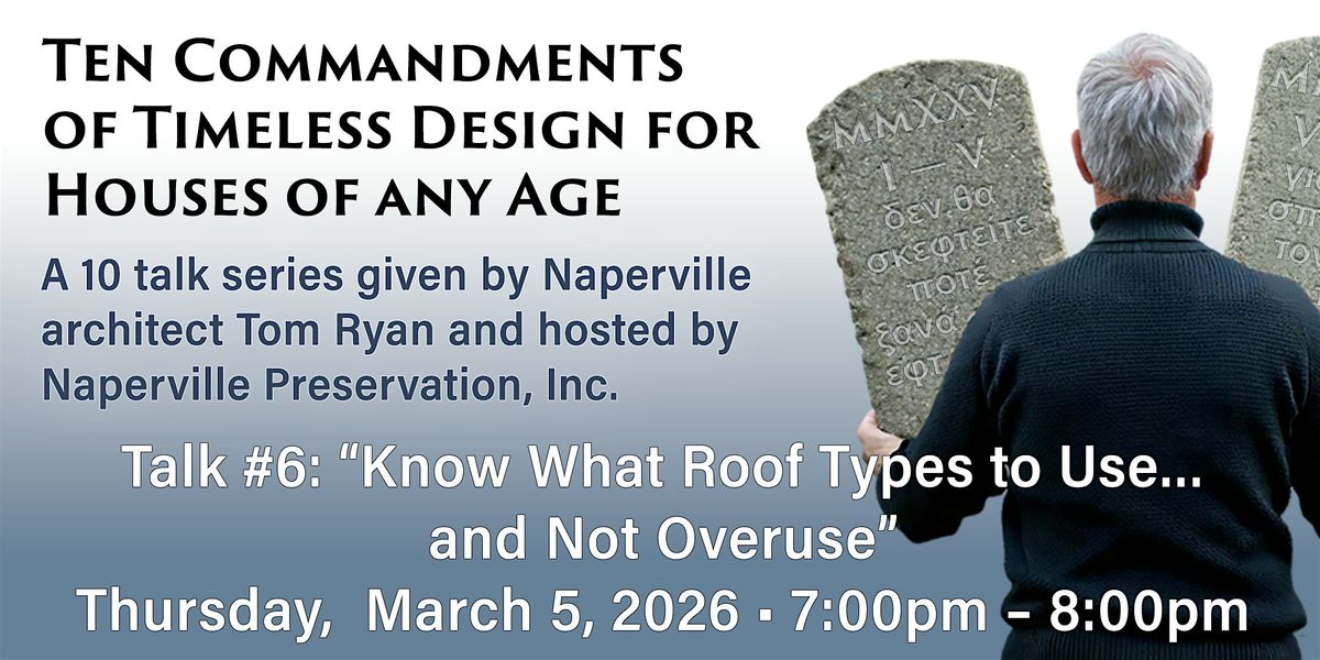 Please join Naperville Preservation Inc.’s Tom Ryan as he continues his ten part series Commandments of Timeless Design for Houses of Any Age with Commandment #6, Know What Roof Types to Use…and Not Overuse. He’ll begin 2026 with a new street by street focus of our beloved Historic District. First up, the houses along Center and Ellsworth Streets!