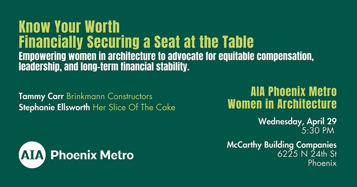 All are welcome to join AIA Phoenix Metro’s Women in Architecture for Know Your Worth: Financially Securing a Seat at the Table, an engaging conversation on empowering women in architecture to advocate for equitable compensation, leadership, and long-term financial stability.