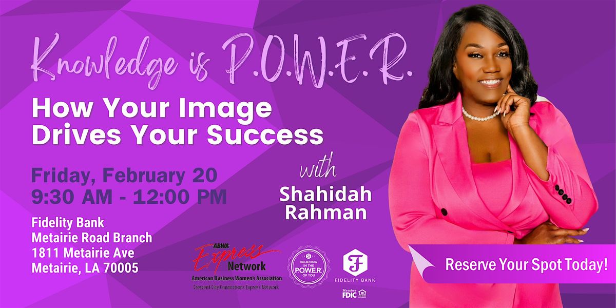 Join us for an enlightening Knowledge is POWER event, featuring Shahidah Rahman, Image Consultant, Confidence Coach, and Public Speaker. She will present one of her signature talks: “Elevate Your Image, Elevate Your Profit: How Image Drives Revenue.”