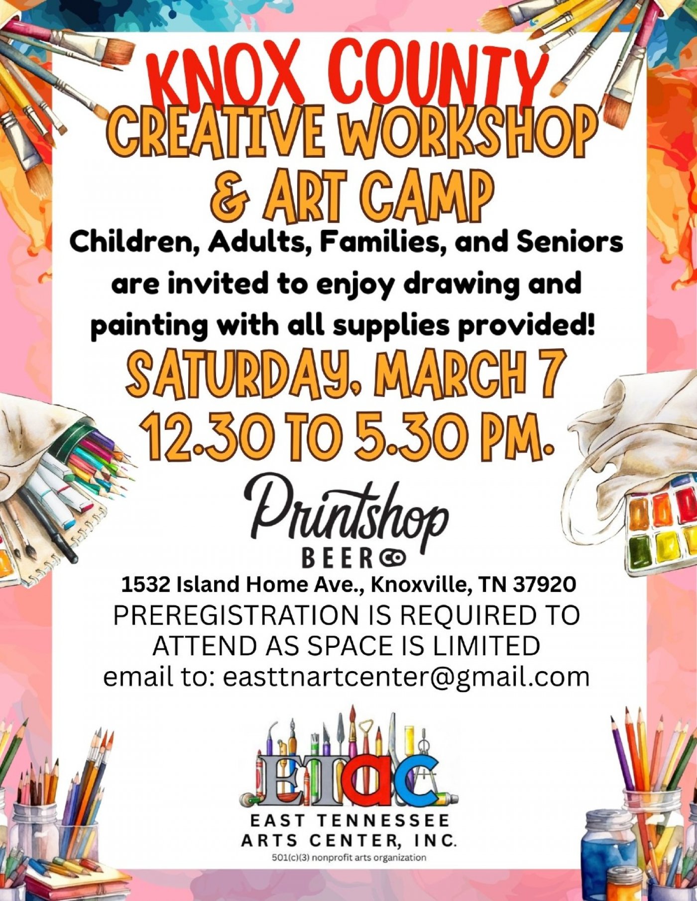 Creative workshop and Art Camp for children, families, and seniors. All art supplies are provided for drawing and painting. Donations appreciated. Information from [email protected]. Preregistration is required as space is limited.