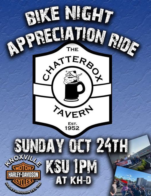 Join our friends at Knoxville Harley Davidson for their Appreciation ride to the Box! Kick Stands Up at 1 p.m. at their Clinton Hwy location. After a nice ride you'll end up at your favorite watering hole where BBQ and all the fixins will be waiting for you.