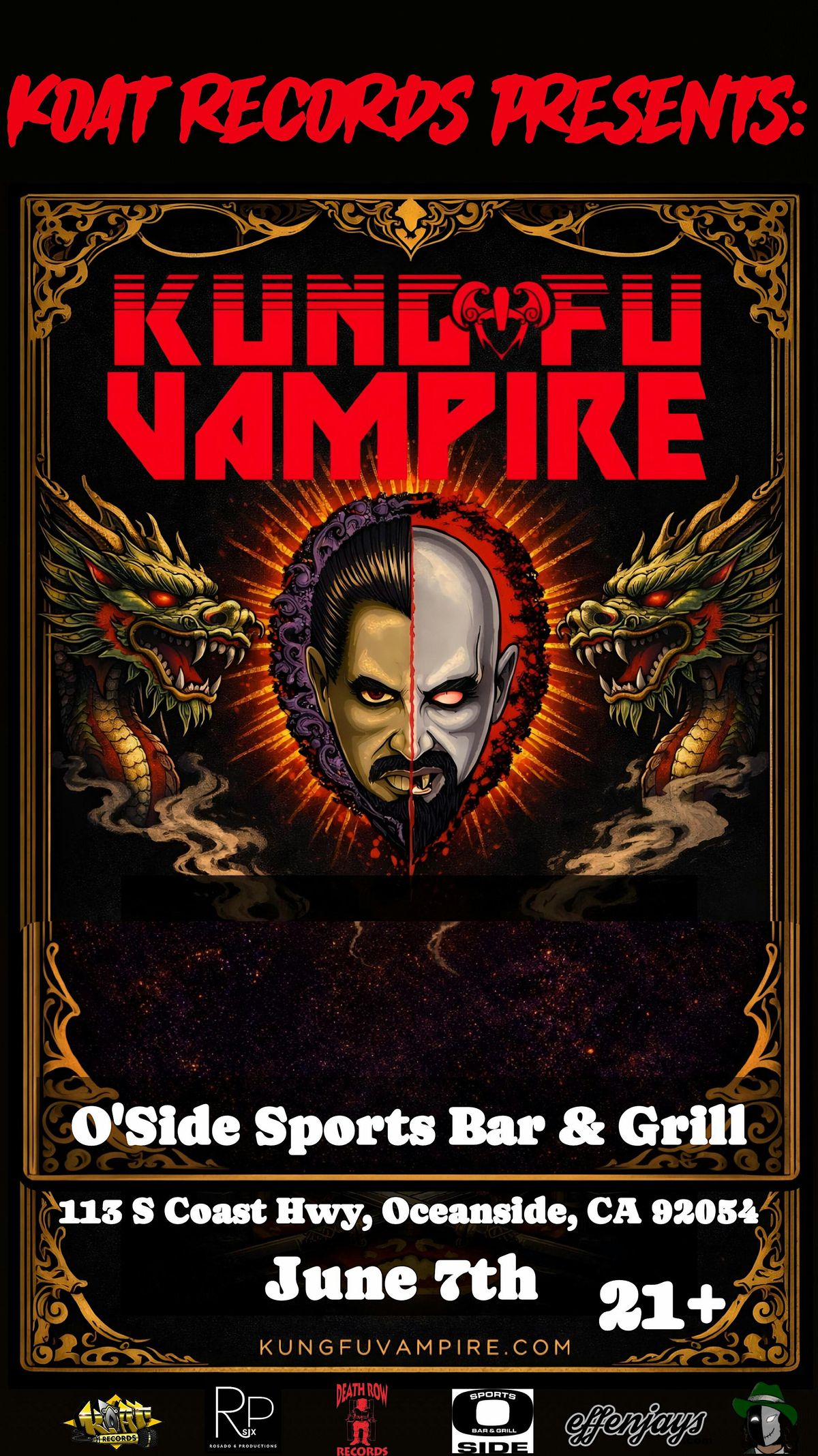 KOAT Records Presents: Kung Fu Vampire Live at O’Side Sports Bar & Grill is a high-energy underground hip-hop event scheduled for June 7, 2026. This 21+ show brings the "Gothic Hip-Hop" pioneer to a coastal setting for an intense, live-instrument-backed performance. His sets are noted for their innovation, often featuring live orchestration and high-energy visuals.