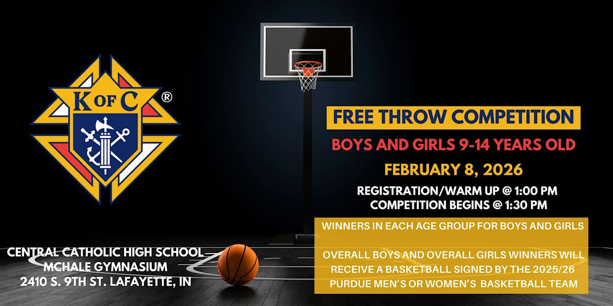 Get ready to show off your shooting skills at the KofC Free Throw Contest! This is an awesome in-person event where you can compete, have fun, and meet fellow basketball lovers. Winners in each gender and age group will move on to the district/regional contest! The overall boy and girl winner will recieve a signed basketball from the Purdue Men's or Women's basketball team!