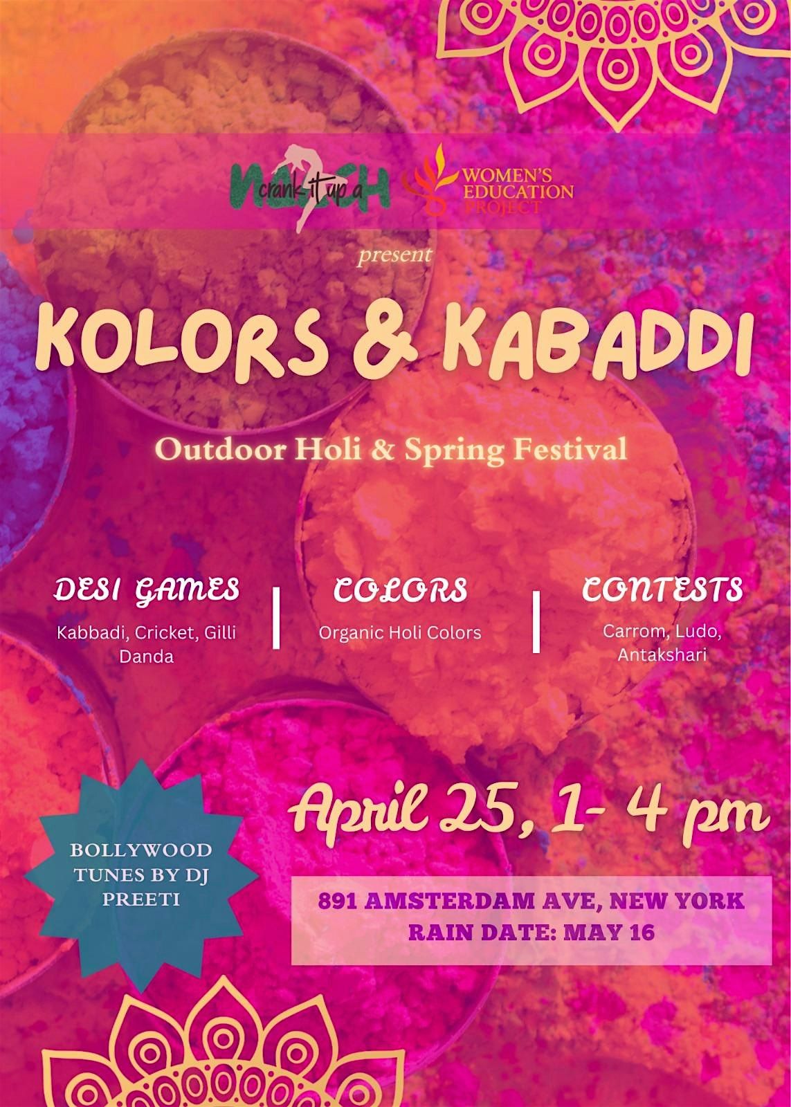 We’re so excited to bring you Kolors & Kabaddi: Holi Springfest — where colors, friendly childhood games, and Bollywood beats come together for an unforgettable spring celebration!
