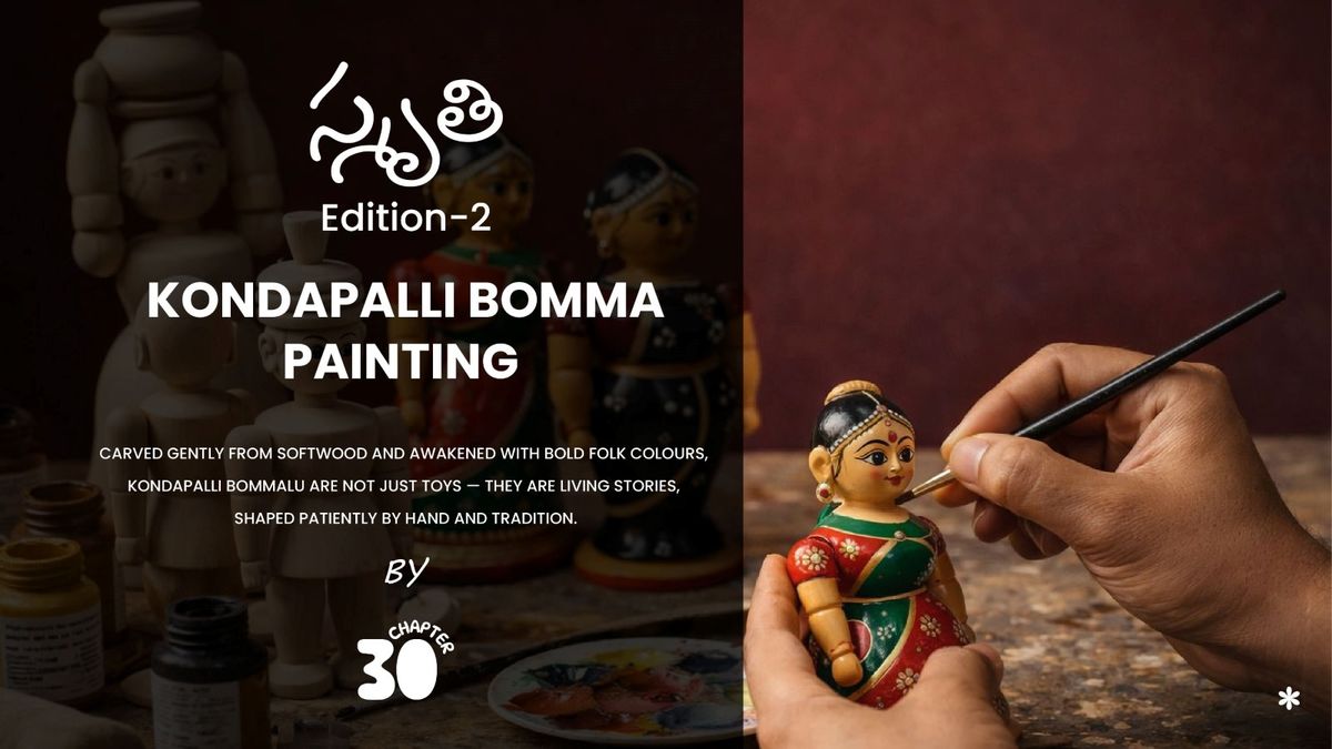 Presented by స్మృతి (Smruthi) – Edition 2Kondapalli Bommalu is a celebrated wooden toy tradition from Andhra Pradesh, known for its bold folk colours, clean forms, and narrative charm. Crafted from softwood, these toys depict everyday life through dancers, birds, village scenes, and everyday motifs.In this guided, beginner-friendly workshop, participants will learn the basics of Kondapalli bomma painting — including outlining, brush control, shading, detailing, and finishing techniques inspired by traditional artisans. Each participant will paint a raw Kondapalli doll using provided materials and take home their completed bomma along with a keepsake card and gift bag.