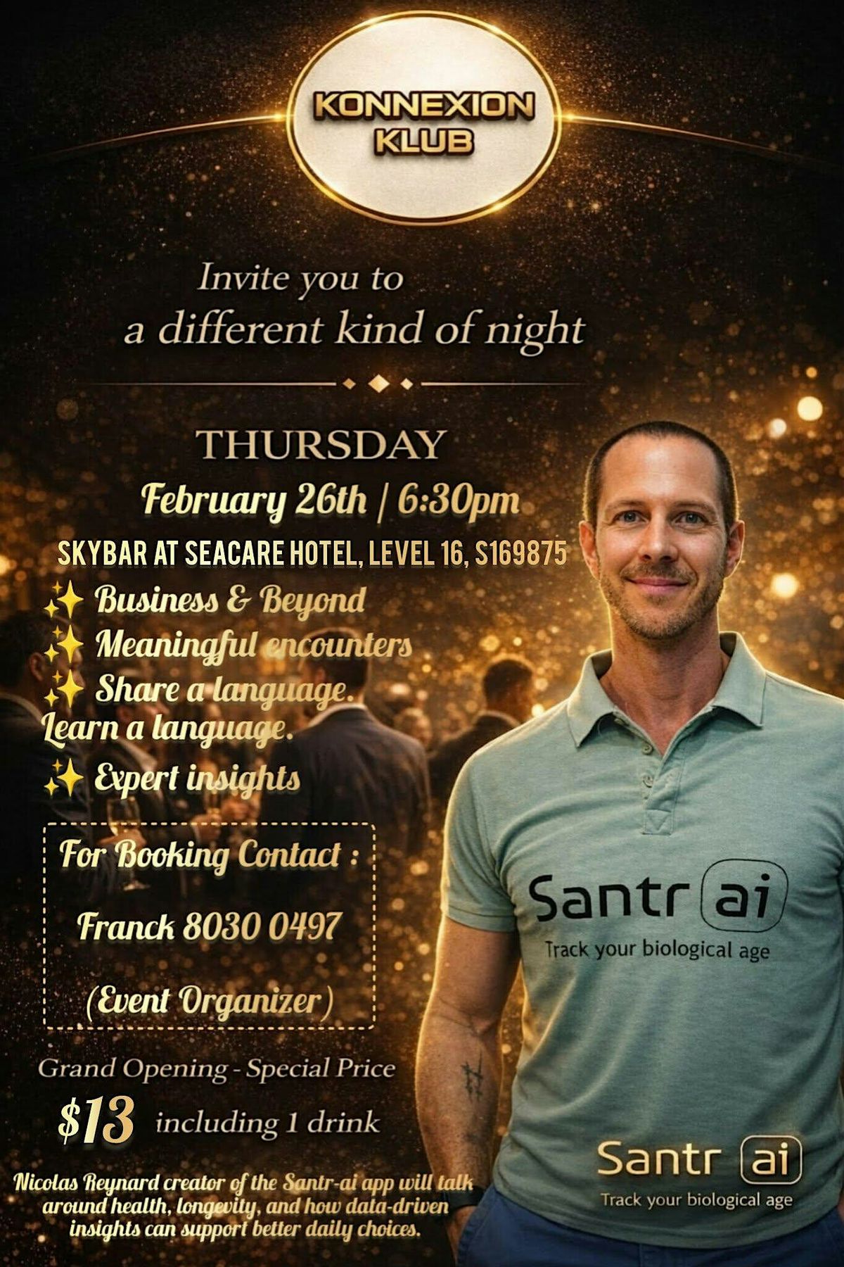 Share your business, and find a job! Get the opportunity to meet and break the ice by code-color bracelet! Learn and exchange languages! It will take place in a Sky Bar, where the city fades away and conversations rise above the clouds.