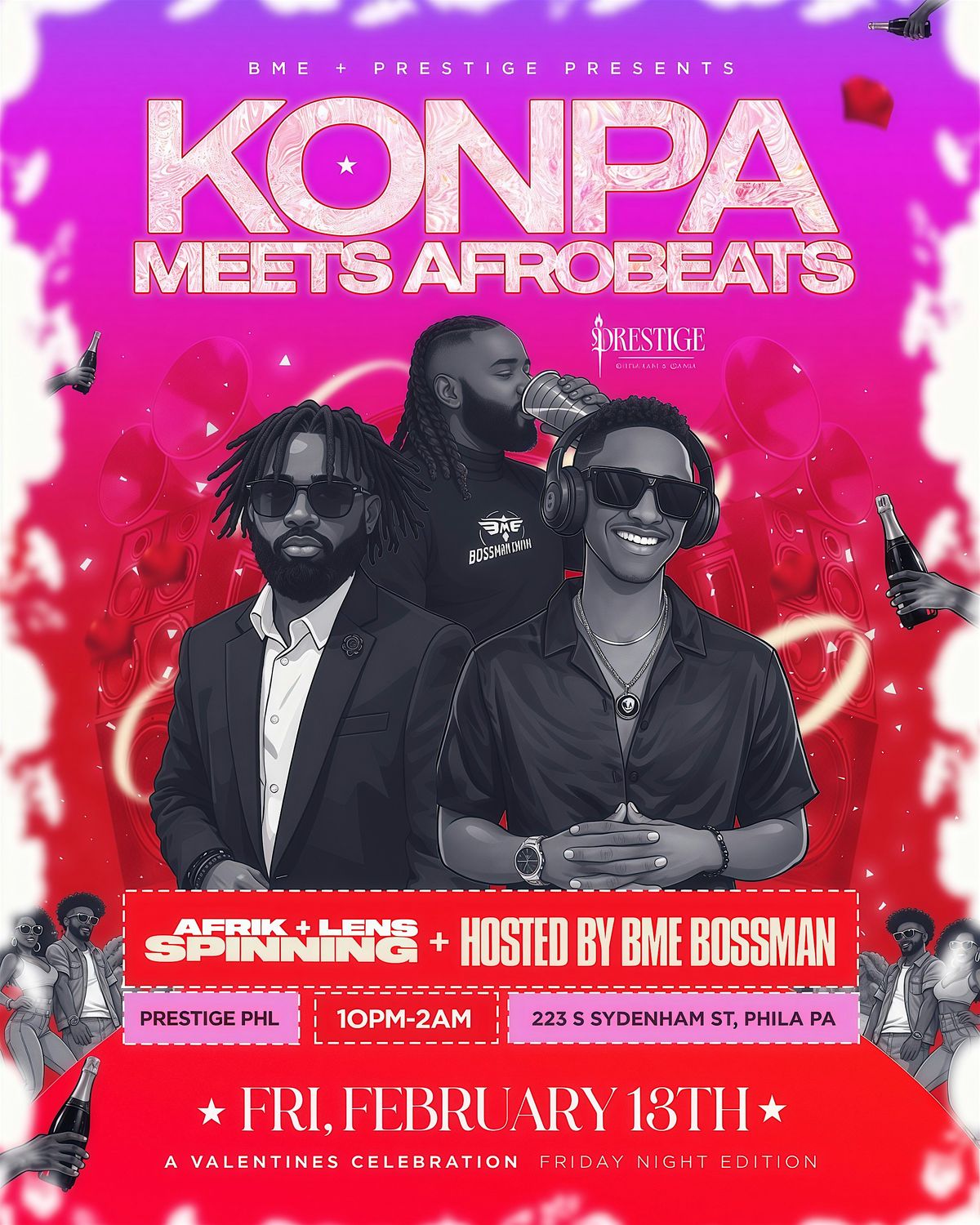 Welcome to the Konpa Meets Afrobeats ‘ Valentine Celebration happening at Prestige by Vesper! Get ready for a night filled with amazing music and great vibes. Join us on February 13, 2026 at 10:00 PM (Eastern Time) as we bring together the best of Konpa and Afrobeats music for a special Valentine's celebration. Don't miss out on this unique fusion of sounds that will have you dancing all night long. See you there!