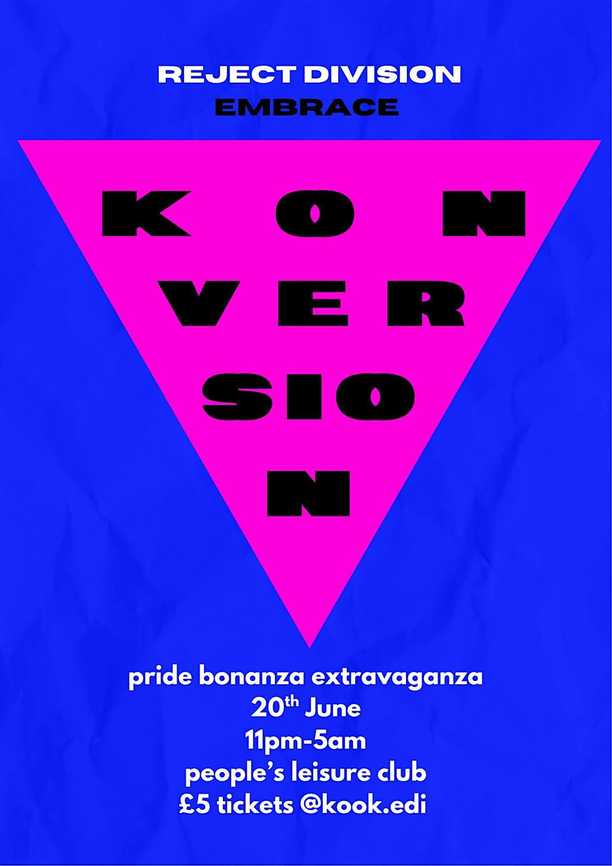 Konversion returns to its birthplace for a very special Edinburgh Pride bonanza! Expect fierce DJs, gorgeous gogo dancers, and a huge to fit in on queer Edinburgh's biggest night!
