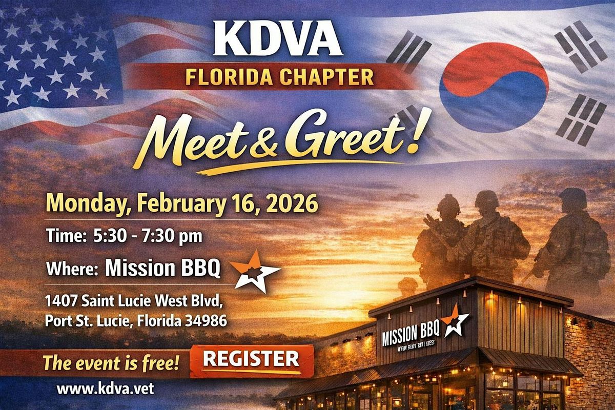 The Korea Defense Veterans Association Florida Chapter is excited to hold its February "Meet & Greet" on Florida's Treasure Coast in Port St. Lucie. Join us to share your personal story of service in Korea with other Korea veterans of all ages and eras. You do not need to be a member to attend this free fun event, but please RSVP at KDVA.vet so we can get an accurate headcount.