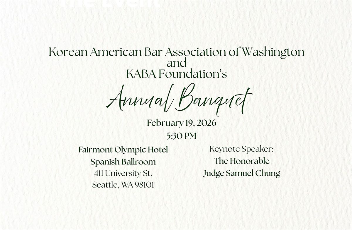 Join the Korean American Bar Association (KABA) of Washington and KABA Foundation to celebrate our history of community service and professional development at our annual banquet on Thursday, February 19, 2026. We look forward to celebrating KABA and its accomplishments, including a musical performance by members of the Seattle Symphony Orchestra!