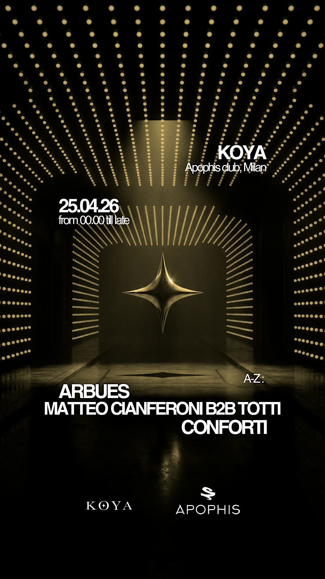 KOYA returns to Milan for a night of deep electronic sounds, hypnotic grooves, and immersive atmospheres at @apophis starting from 00:00 till late.