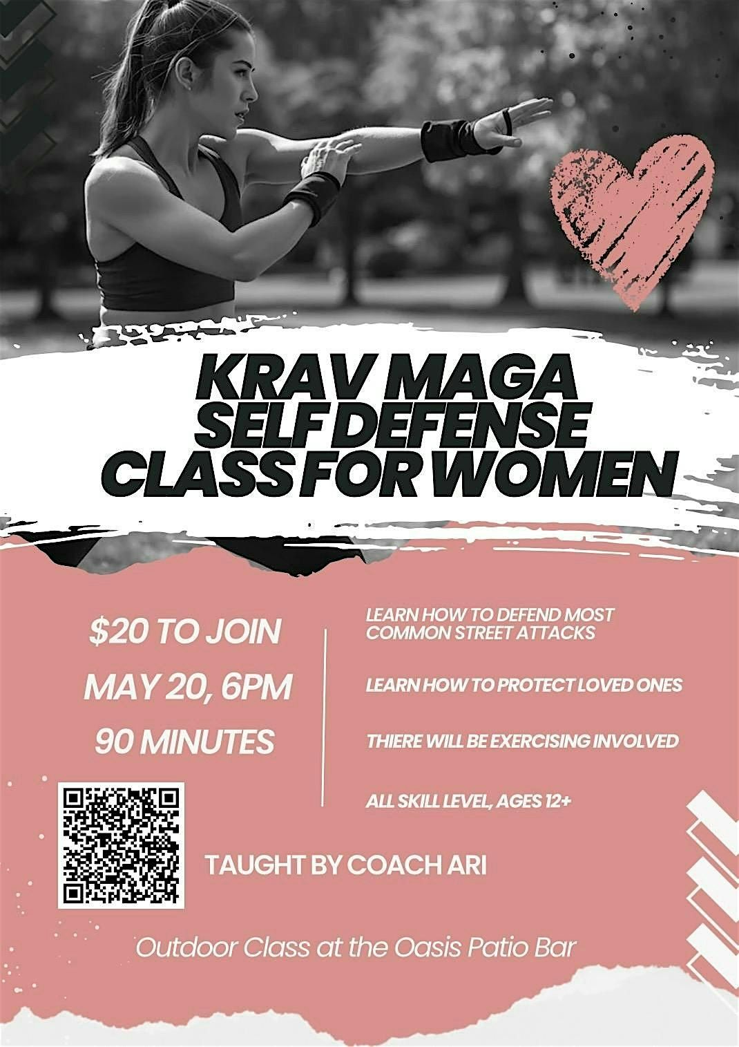 Join us for an empowering 90 minute Krav Maga workshop, open to ALL SKILL LEVELS ages 12+. Krav Maga is a martial art focused on real-world self-defense and street-fighting techniques. With no rules, Krav Maga teaches you to target vulnerable areas such as the groin, solar plexus, and throat—areas that cannot be strengthened in the gym.