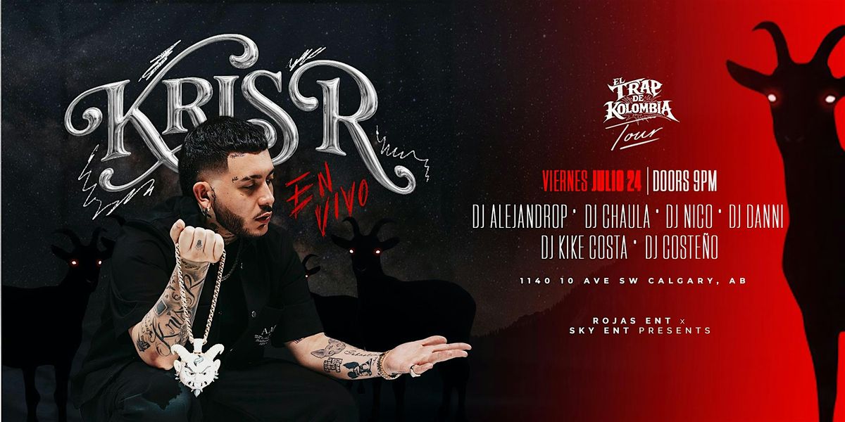 KRIS R llega a Calgary en vivo como parte de su tour mundial “EL TRAP DE KOLOMBIA”, trayendo toda la energía del trap colombiano directamente al escenario. Prepárate para una noche cargada de hits, perreo y una vibra que no se vive todos los días.