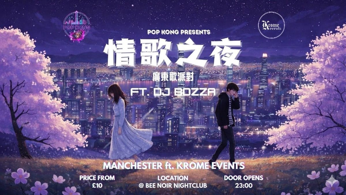 Krome Events x Popkong Proudly Presents: Manchester Cantopop - Love Song Night ?Krome Events x Popkong Proudly Presents: Manchester Cantopop - Love Song Night ?When it comes to Cantopop,How could love songs ever be missing?This night, we’ll be playing love songs from your era.There will be at least one songthat brings back sweet, happy memoriesor the kind that still hurts.When a familiar melody starts playing, you’ll suddenly remember a scene, a name, or even a relationship you haven’t spoken about in years.