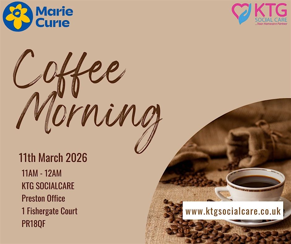 Join us for a lovely in-person coffee morning where you can chill, chat, and connect! Whether you’re curious about what Marie Curie and KTG Socialcare do or just want a cozy spot to meet new friends, this event’s for you. Swing by, grab a cuppa, and enjoy good vibes and great company. Don't miss out on this awesome chance to relax and learn more about two fantastic organizations!