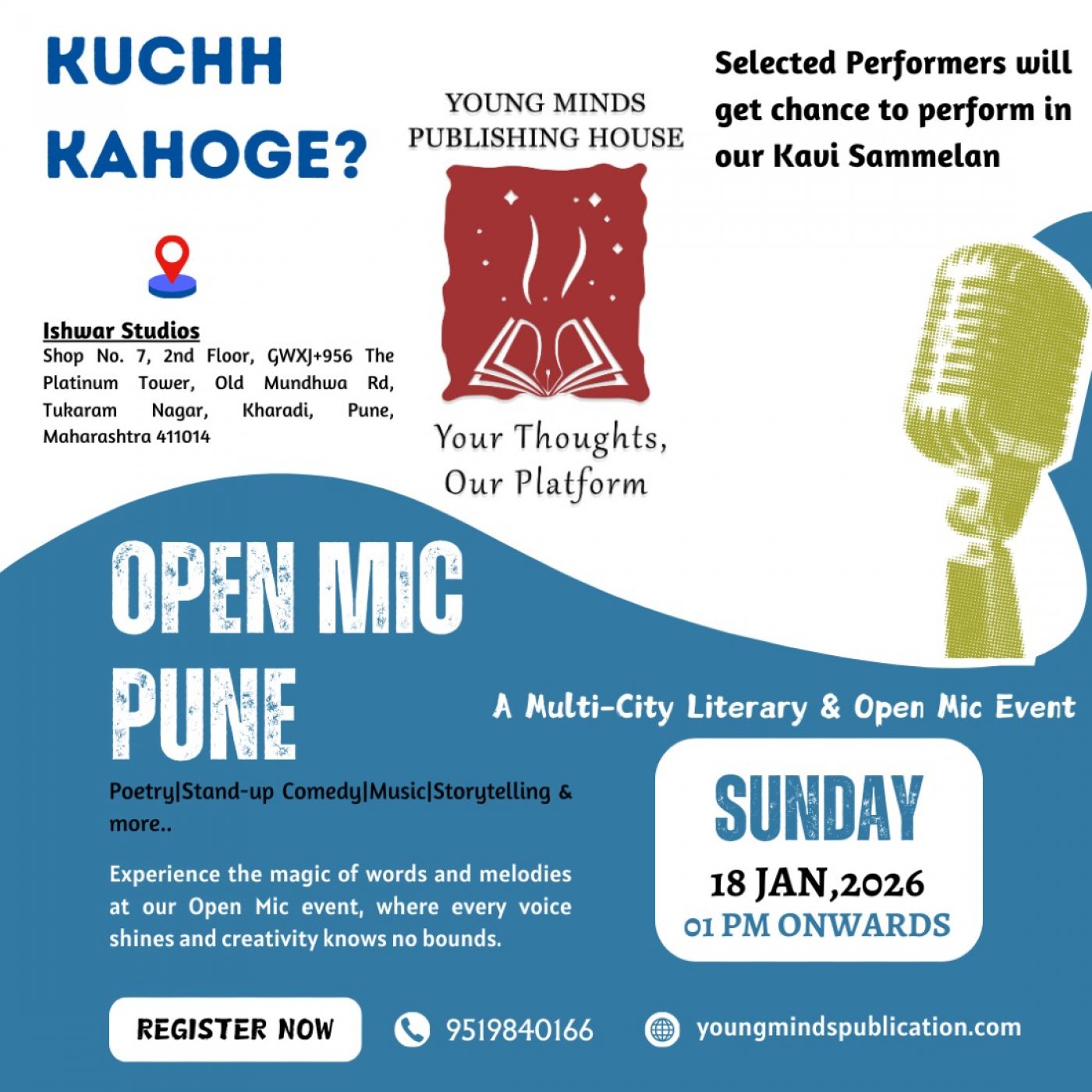 Are you ready to immerse yourself in a captivating world of words and emotions? Join us at "Kuchh Kahoge? (Open Mic Pune)" presented by Young Minds Publishing House, a truly unique open mic experience that will leave you spellbound.